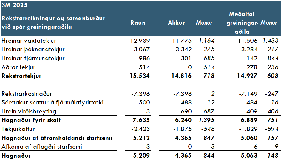 Hér að neðan má sjá samantekt á uppgjöri bankans borið saman við spá AKKUR og meðaltal greiningaraðila.