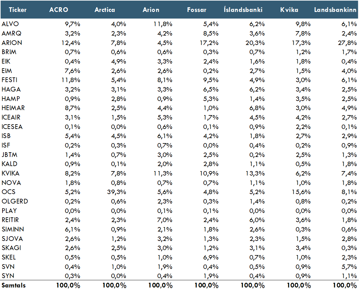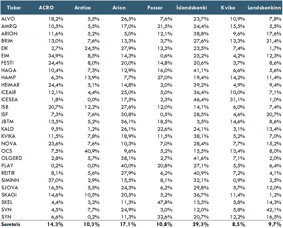 Hér má sjá hvernig velta félaga skiptist niður á miðlara