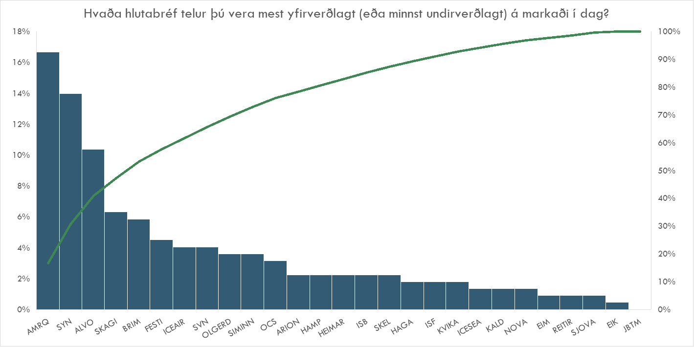 Spurning 4 - Hvaða hlutabréf telur þú vera mest yfirverðlagt (eða minnst undirverðlagt) á markaði í dag?