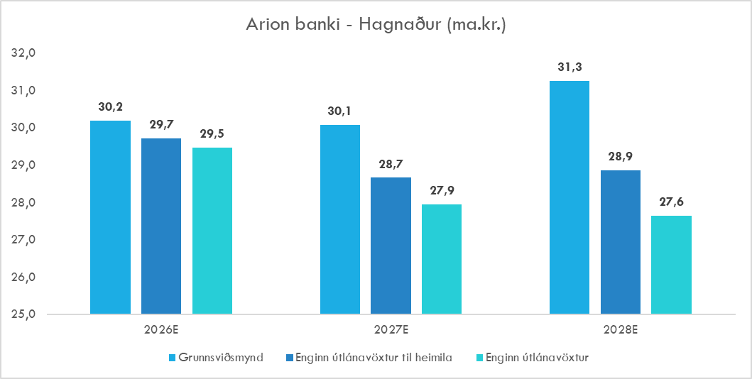 Áhrifin á verðmat er lækkun um u.þ.b. 5% í tilfelli Arion banka í báðum sviðsmyndum en um 7-9% hjá Íslandsbanka enda eru vaxtatekjur stærri hluti afkomu þar og hefur þetta því hlutfallslega meiri áhrif. Það myndi auðvitað breytast með sameiningu við Skaga (VÍS) en ekki er tekið tillit til þess hér.