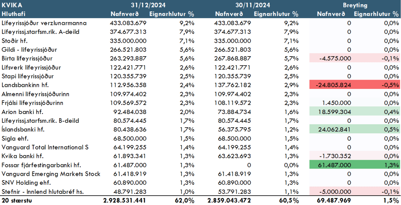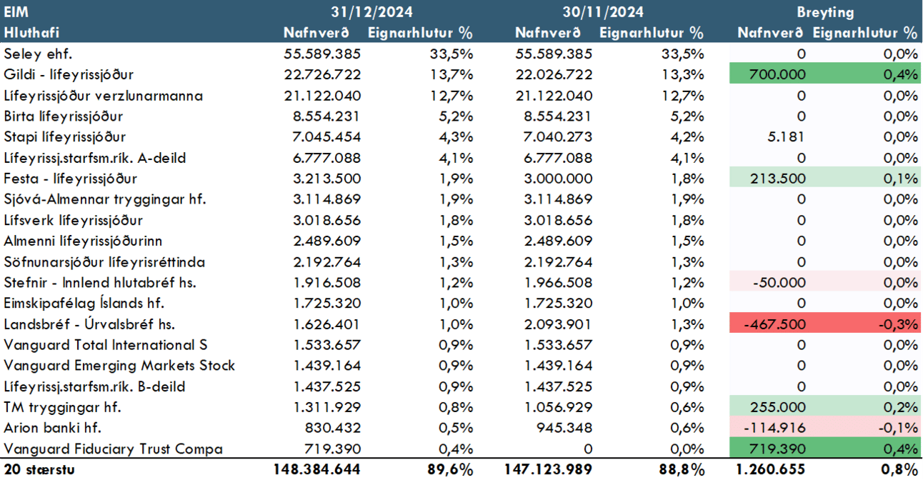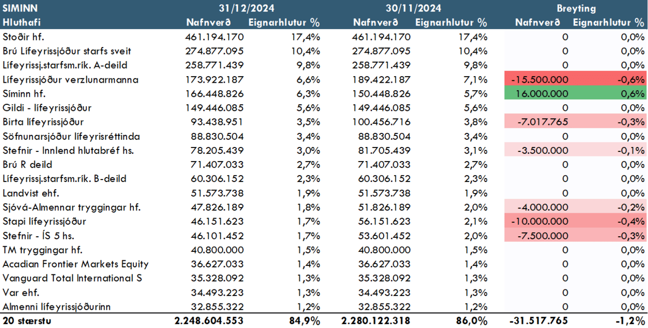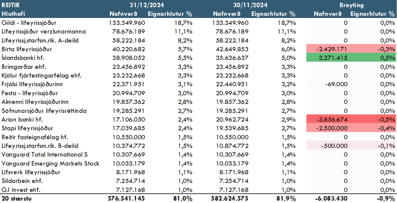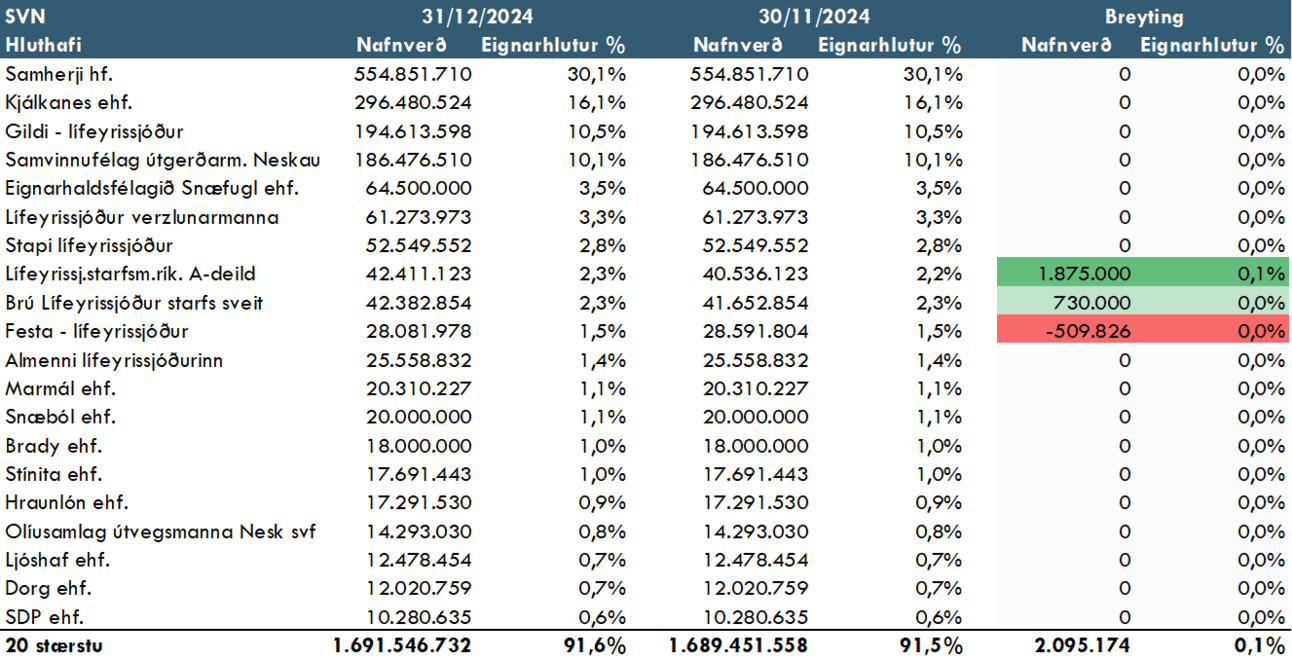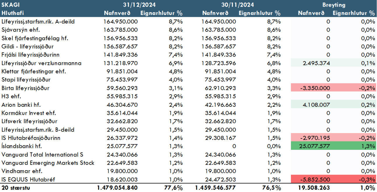 20 stærstu hluthafar skráðra félaga í lok desember 2024 og breyting frá nóvember