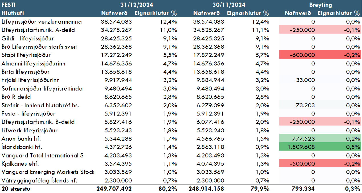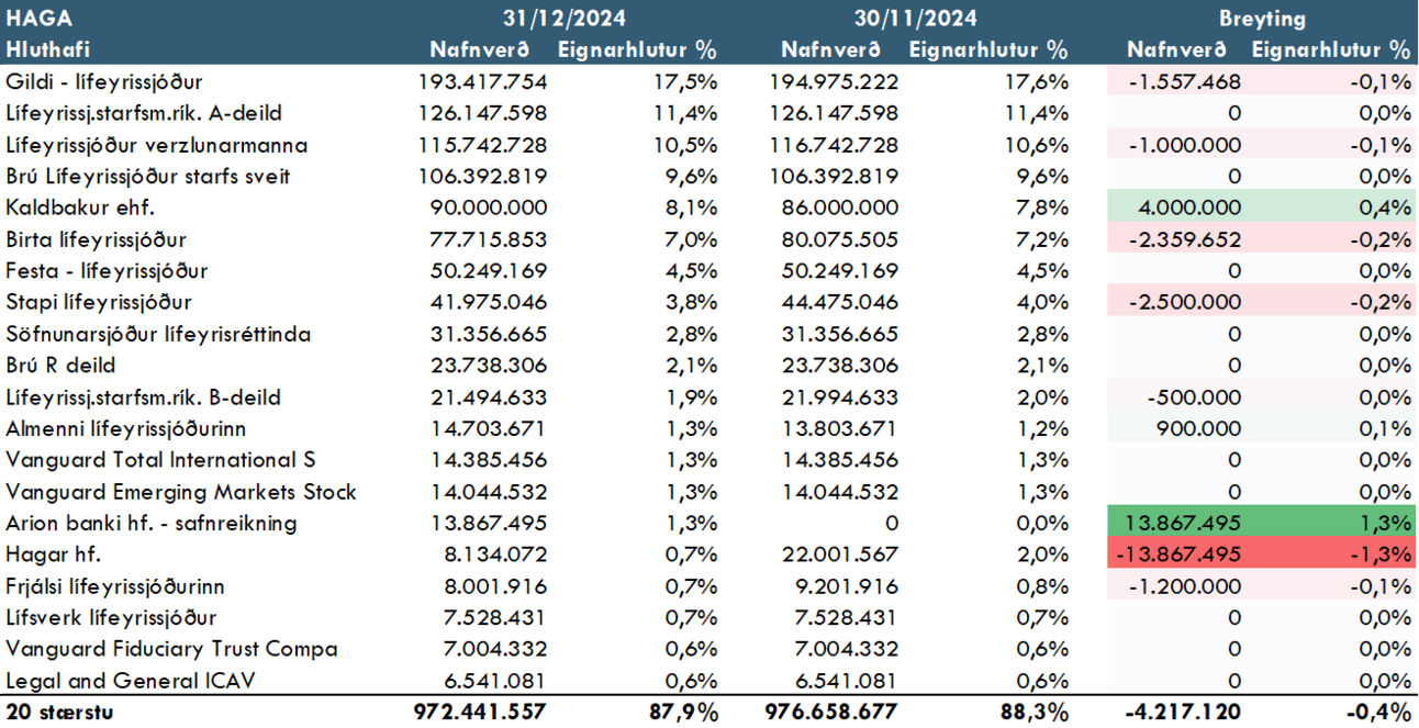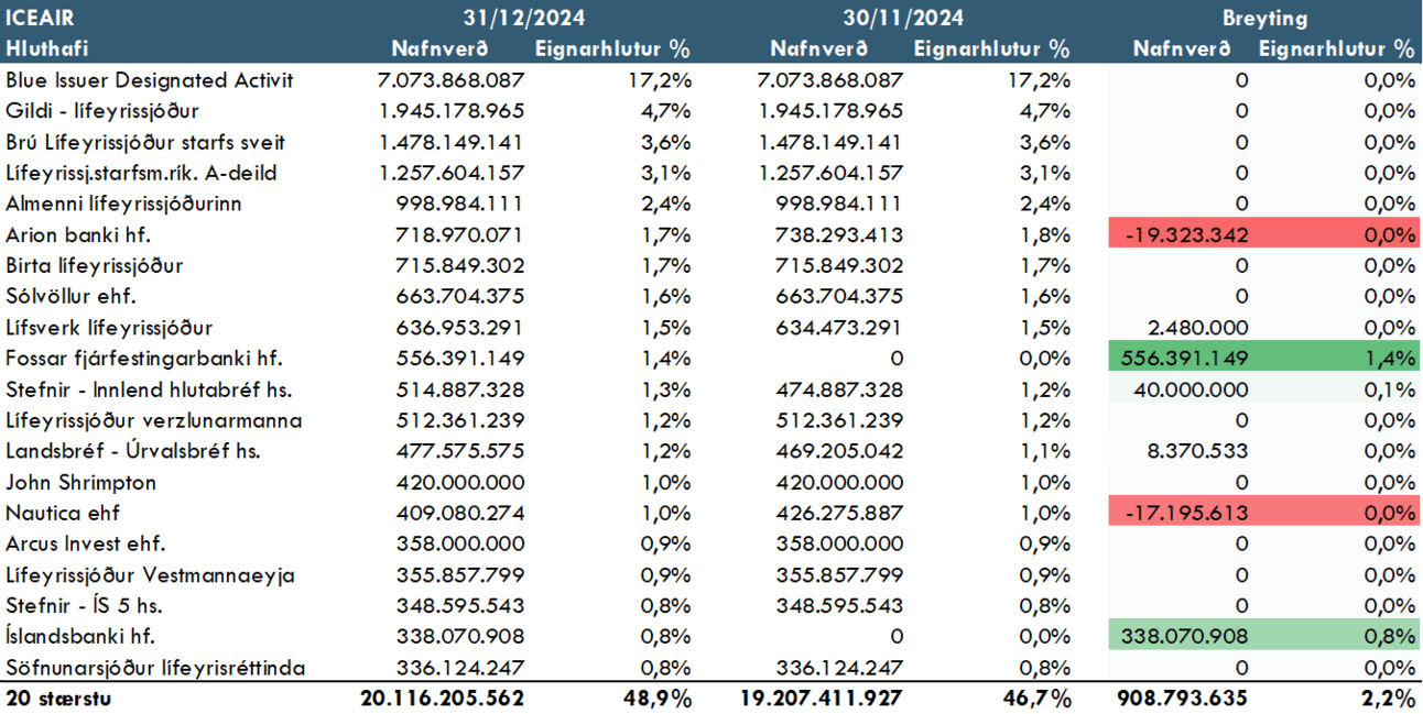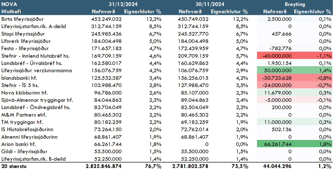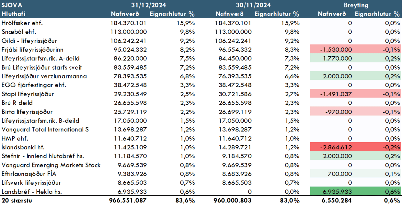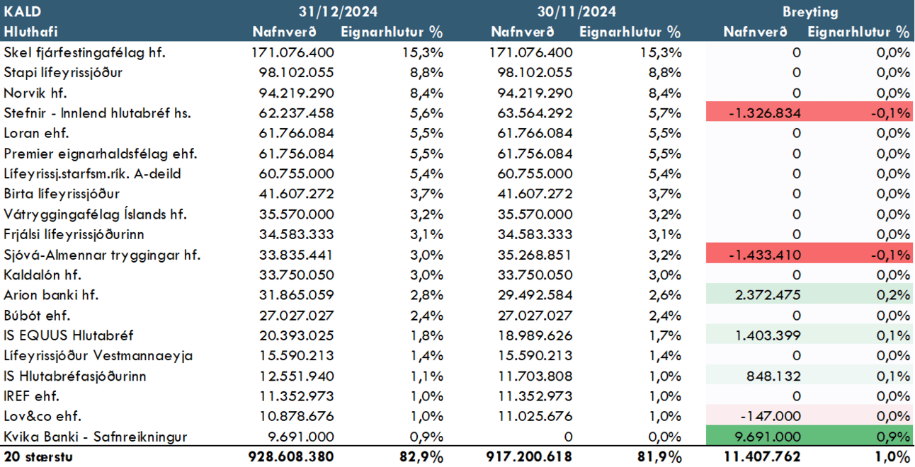 20 stærstu hluthafar skráðra félaga í lok desember 2024 og breyting frá nóvember
